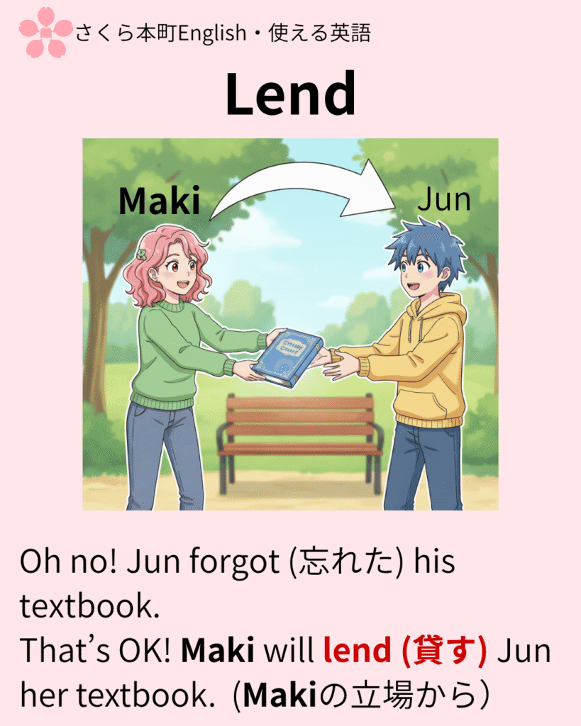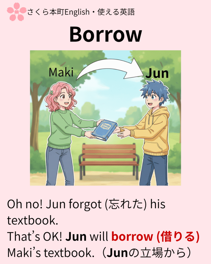 Junが教科書を忘れた時、Makiから借りる時(Junの立場から説明する時)はborrowを使う。
