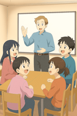 中学生グループレッスンでは、学校で学んでいる英語の授業内容やテーマに沿って、実践的な練習を通じて理解を深めます。文法や語彙の定着だけでなく、実際の場面で使える英語力を育てることを重視しています。さらに、ペアワークやグループディスカッション、ロールプレイなどの多様なコミュニケーション活動を積極的に取り入れ、自分の考えや気持ちを英語で伝える力(発信力)を養います。少人数制のため、一人ひとりがしっかりと発話できる環境が整っており、英語への自信も自然と身につきます。また、定期的に与えられたテーマについて発表の練習も行います。